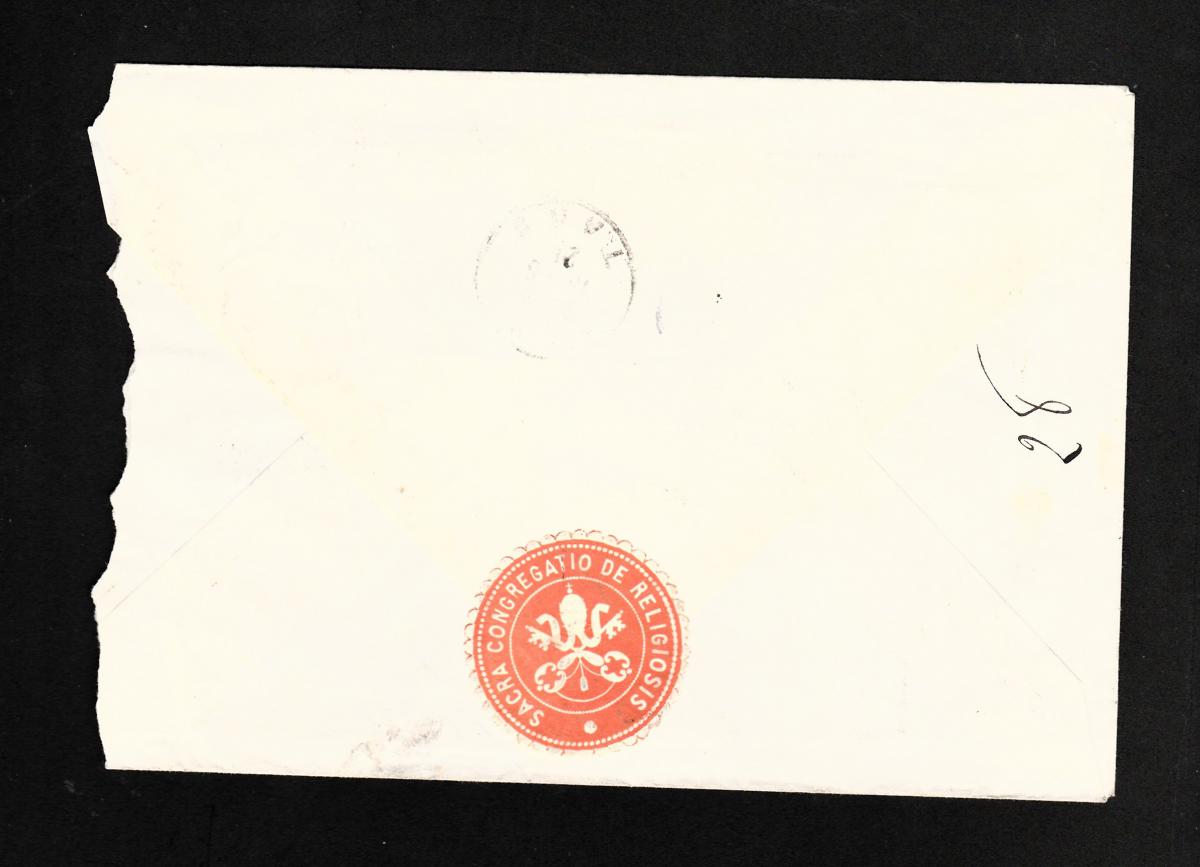 Enveloppe adressée à Mgr l'évêque d'Albi aux bons soins du curé de la Trinité.Postée à Rome en recommandé